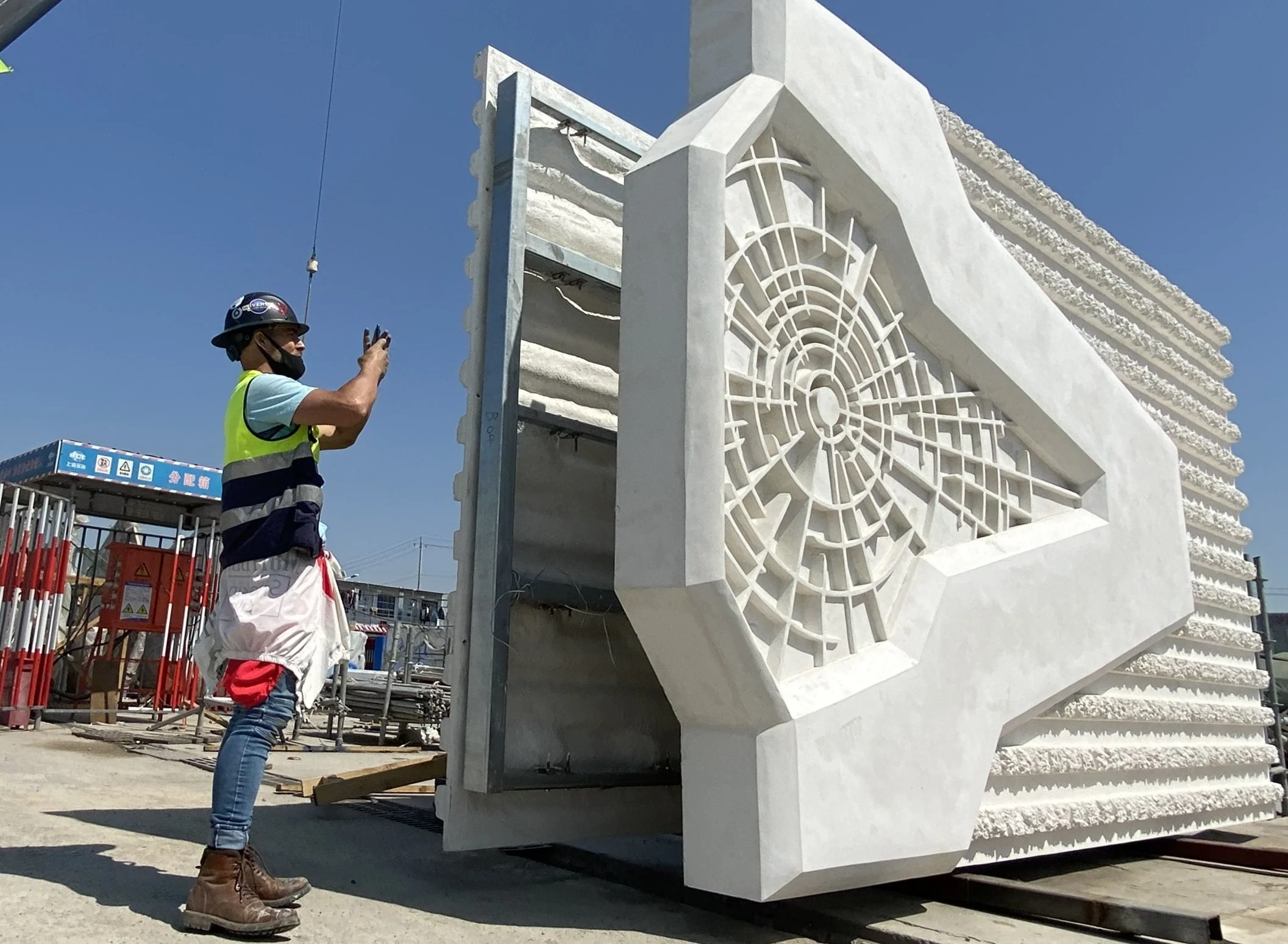 Prefabricated pieces are packaged and moved to site — with attention to fragility, scale, and storage environment