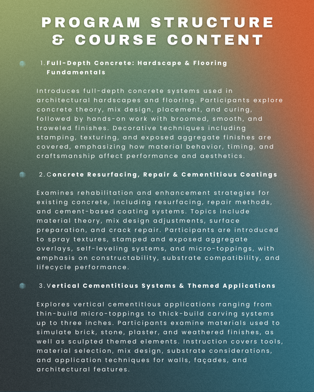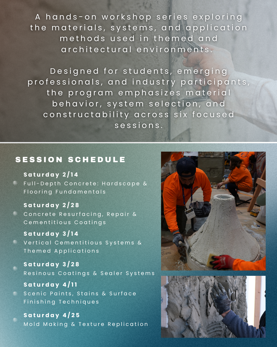 Each workshop combines instruction, live demonstrations, and hands-on application giving participants the opportunity to work directly with materials, tools, and systems under professional guidance.